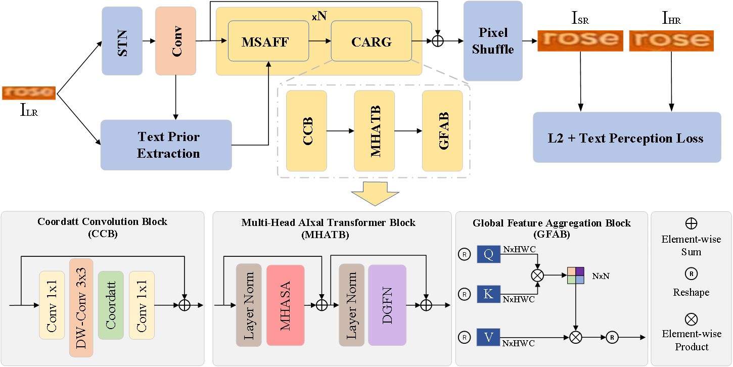 该论文针对传统卷积神经网络全局感受野受限及文本图像语义信息利用不足的问题,提出了一种融合语义先验与多头轴向自注意力的自然场景文本图像超分辨方法。该方法采用多头轴向注意力Transformer块与全局特征聚合模块的残差组替代传统顺序残差块,分别从高度、宽度和通道三个维度提取文本图像的局部结构细节,并实现多层级特征的高效融合,显著拓展了深度网络的横、纵向感受野,从而提升复杂退化条件下文本图像的特征表达能力。同时,为进一步增强模型的语义理解与重建性能,论文构建了一种新的多尺度注意力融合机制,实现文本语义先验特征与图像深度特征的高效交互融合。实验结果表明,该方法在自然场景文本图像超分辨任务中表现优异,在识别精度和视觉清晰度两方面的定性和定量性能指标上均取得了显著提升,为多模态服装图像识别、文本OCR、智能驾驶等相关视觉下游任务提供了有力技术支撑。
