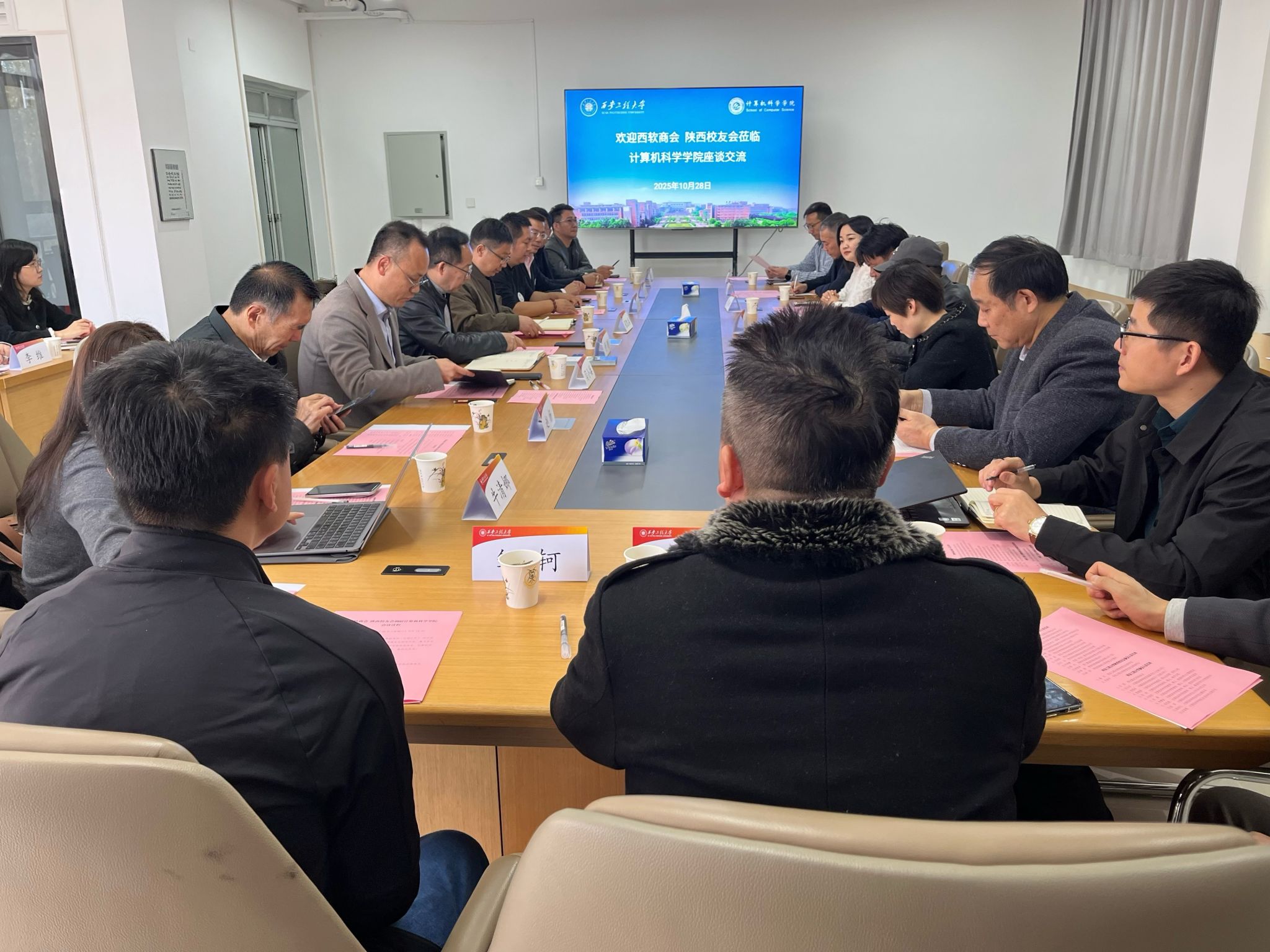 陈林介绍了西软商会的定位及会员企业构成,他指出,当前软件和信息服务业对高素质人才需求迫切,商会汇聚了陕西天诚软件、软通动力等百余家业内头部骨干企业,愿搭建合作平台,通过联合培养、实习实训等形式实现院企互利共赢。学校陕西校友会秘书长秦天介绍了陕西校友会组织架构与服务体系,分享了“服务校友、反哺母校”的工作成效。他表示,校友会将继续发挥桥梁纽带作用,整合校友企业资源,为学院人才培养与就业等工作提供支持。