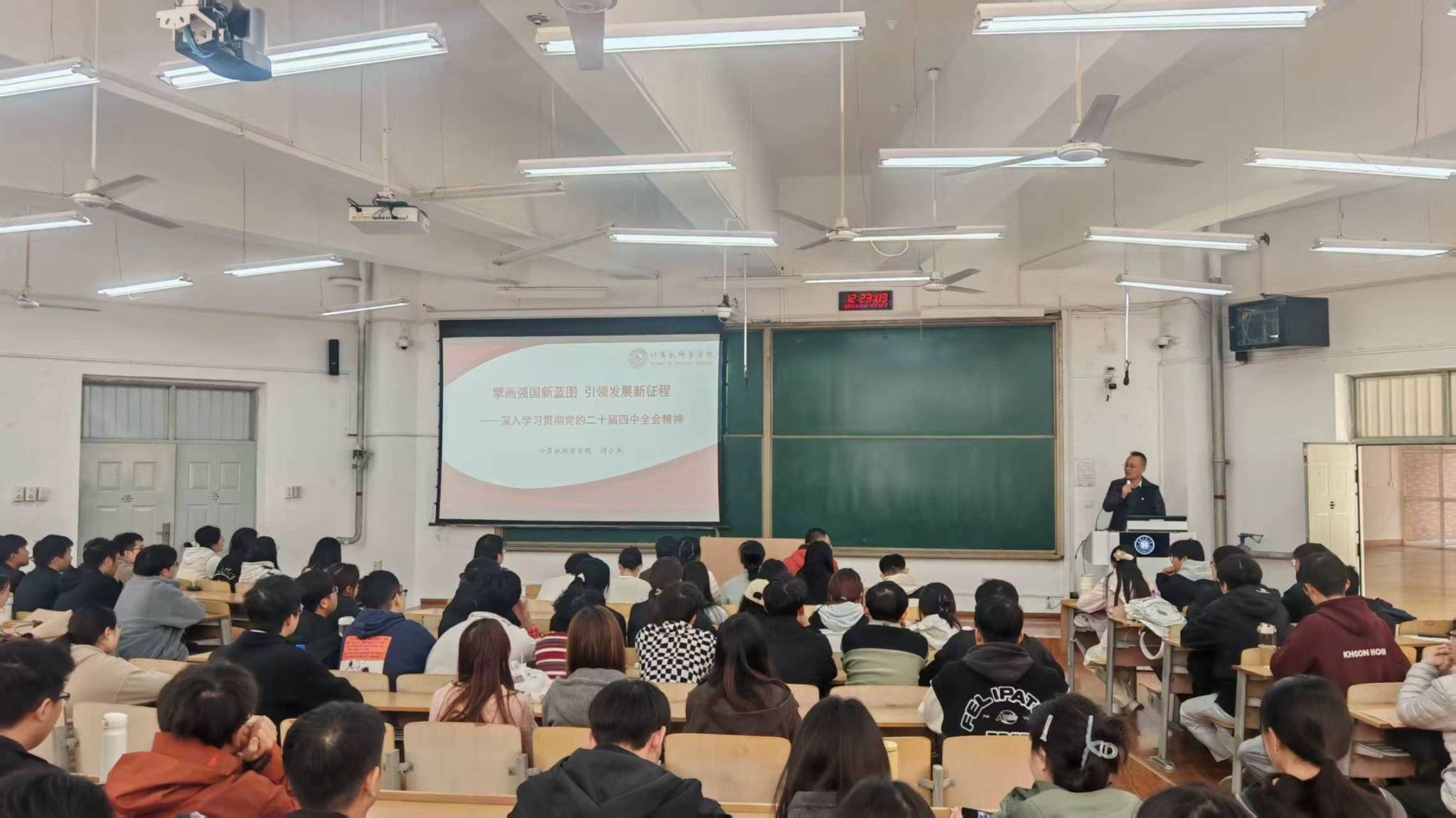 闫小兵做了开班动员讲话,并以“擘画强国新蓝图 引领发展新征程——深入学习贯彻党的二十届四中全会精神”为主题,为全体学员作了党的二十届四中全会精神专题宣讲。同时向全体学员提出两点要求:一是要强化理论武装,把党的二十届四中全会精神学习与党章党史学习贯通起来,带着信念学、带着问题学,要强化实践锤炼,立足计算机专业特色,将理论学习与专业攻坚、志愿服务相结合,以“学思用贯通”的成效展现入党积极分子的先锋模样。二是要严守培训班纪律,珍惜学习机会,主动参与研讨交流,确保学有所获、思有所悟,要将理论学习成果转化为勤奋学习、服务同学、勇担责任的实际行动,以过硬表现向党组织靠拢。
