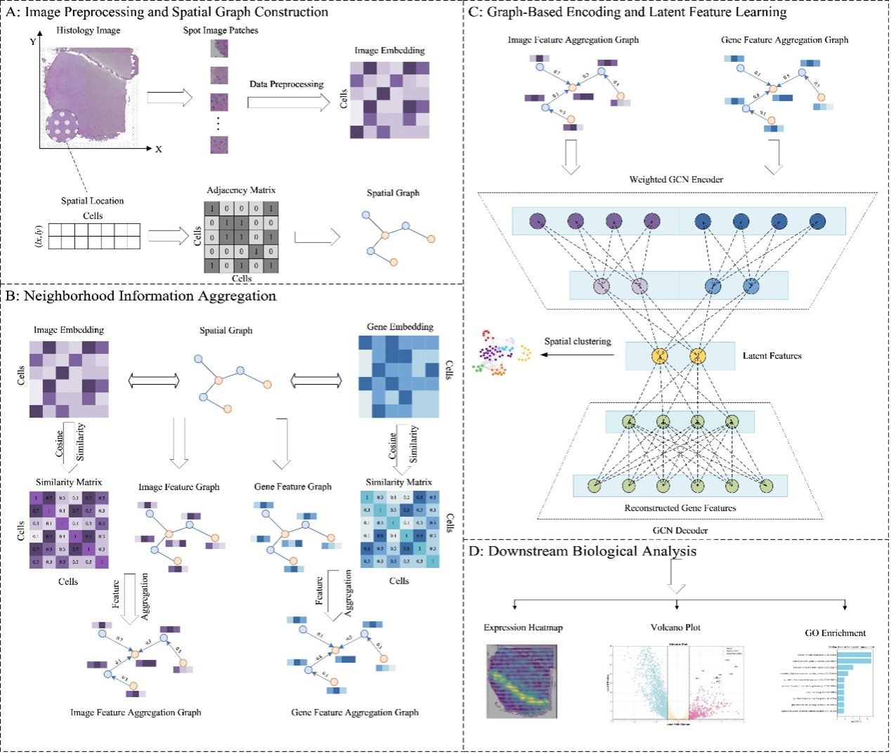 近日,计算机科学学院智能分析与决策科研团队在单细胞空间转录组学研究方向取得重要进展。由杨博老师指导,2023级硕士研究生姬腾飞同学完成的学术论文《AugGCL: Multimodal graph learning for spatial transcriptomics analysis with enhanced gene and morphological data》在计算生物学国际权威期刊《PLOS Computational Biology》(中科院SCI二区期刊、中国计算机学会推荐的交叉领域B类期刊)上发表。