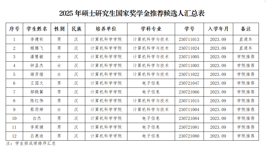 经学生本人书面申请,班级、年级评定小组推荐,学院研究生国家奖学金评审委员会审核认定,2024-2025学年计算机科学学院研究生国家奖学金拟推荐12人。现对评定结果予以公示(附详细名单)。