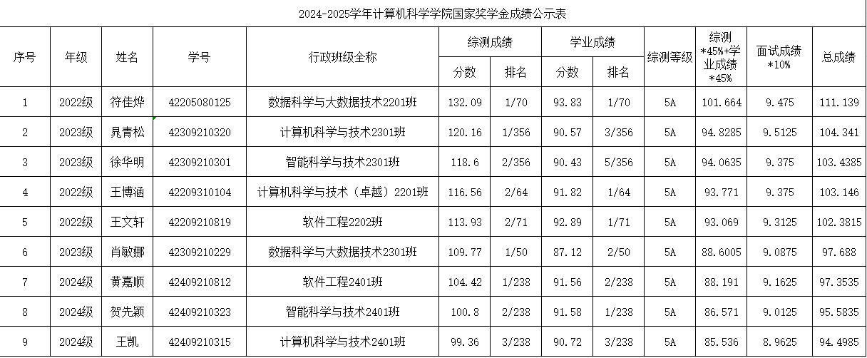 计算机科学学院本科生国家奖学金拟推荐名单公示